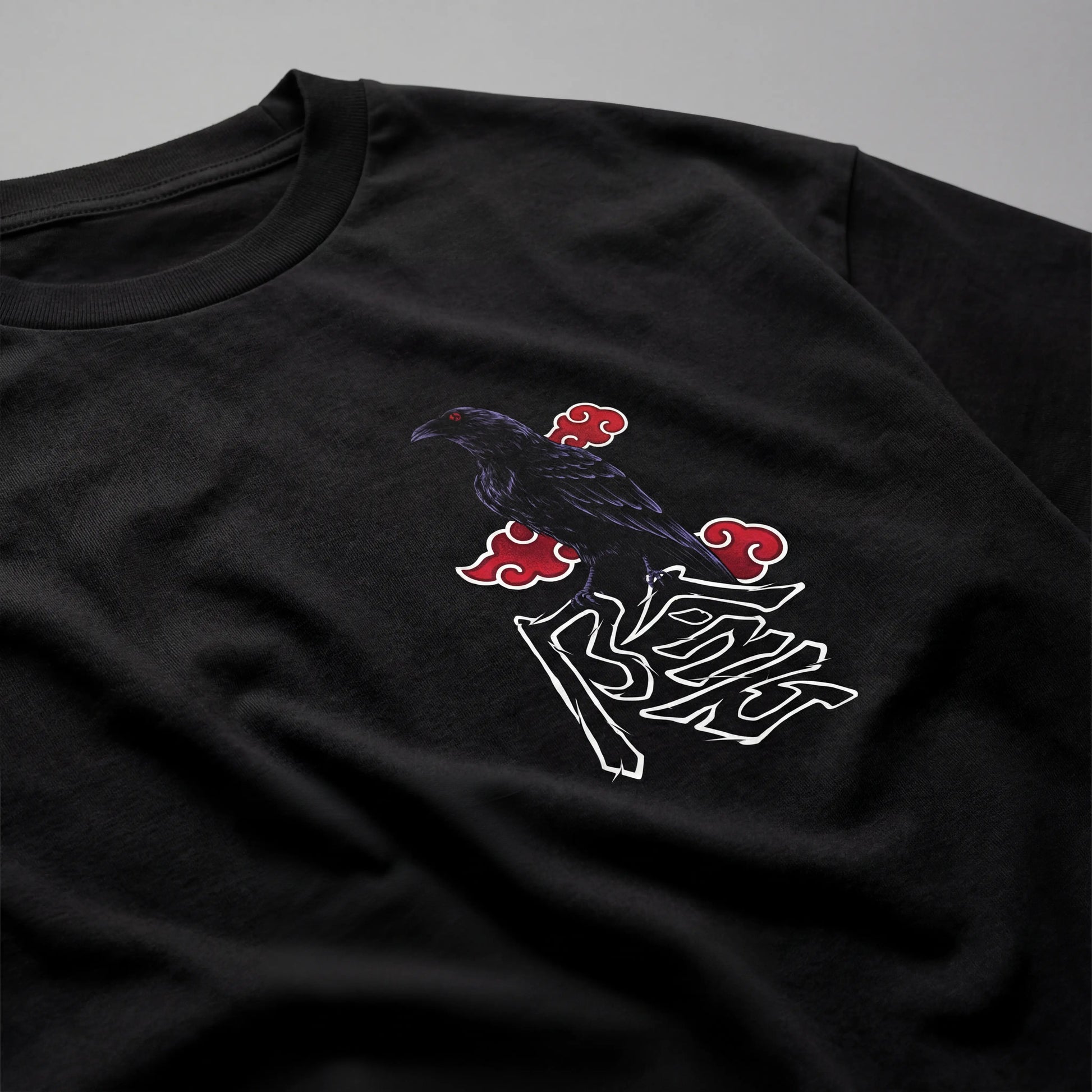 The crow stands atop the symbol as a manifestation of Genjutsu, carrying Shisui’s Mangekyō Sharingan—an ultimate illusion capable of rewriting will. Surrounding Akatsuki clouds reflect the sacrifice and secrecy that defined his path.