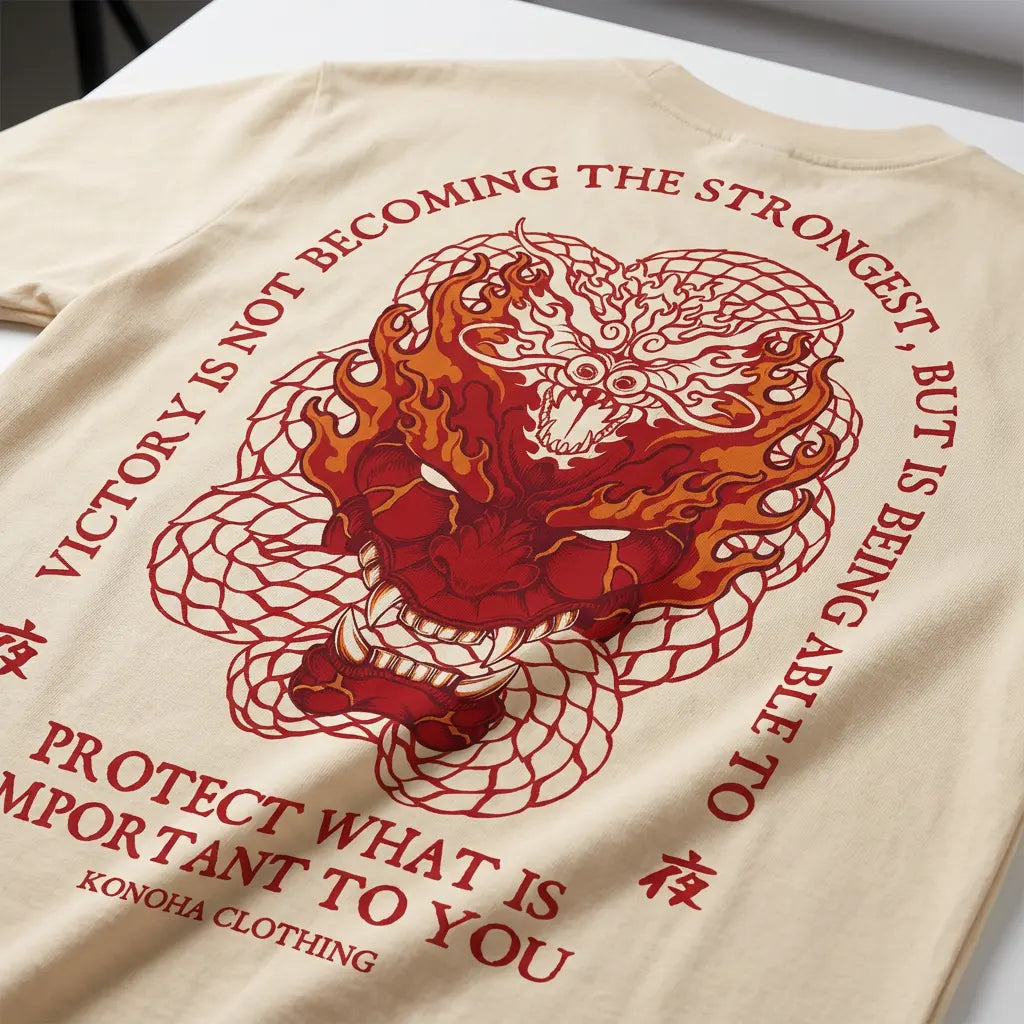 A high-intensity design capturing Might Guy’s ultimate transformation into Night Guy during his battle against Madara. Represented by a fierce Oni Mask emitting a vivid red aura, the composition is circled by a massive, spectral dragon to symbolize the peak of the Eight Inner Gates and the ultimate sacrifice for those he protects.